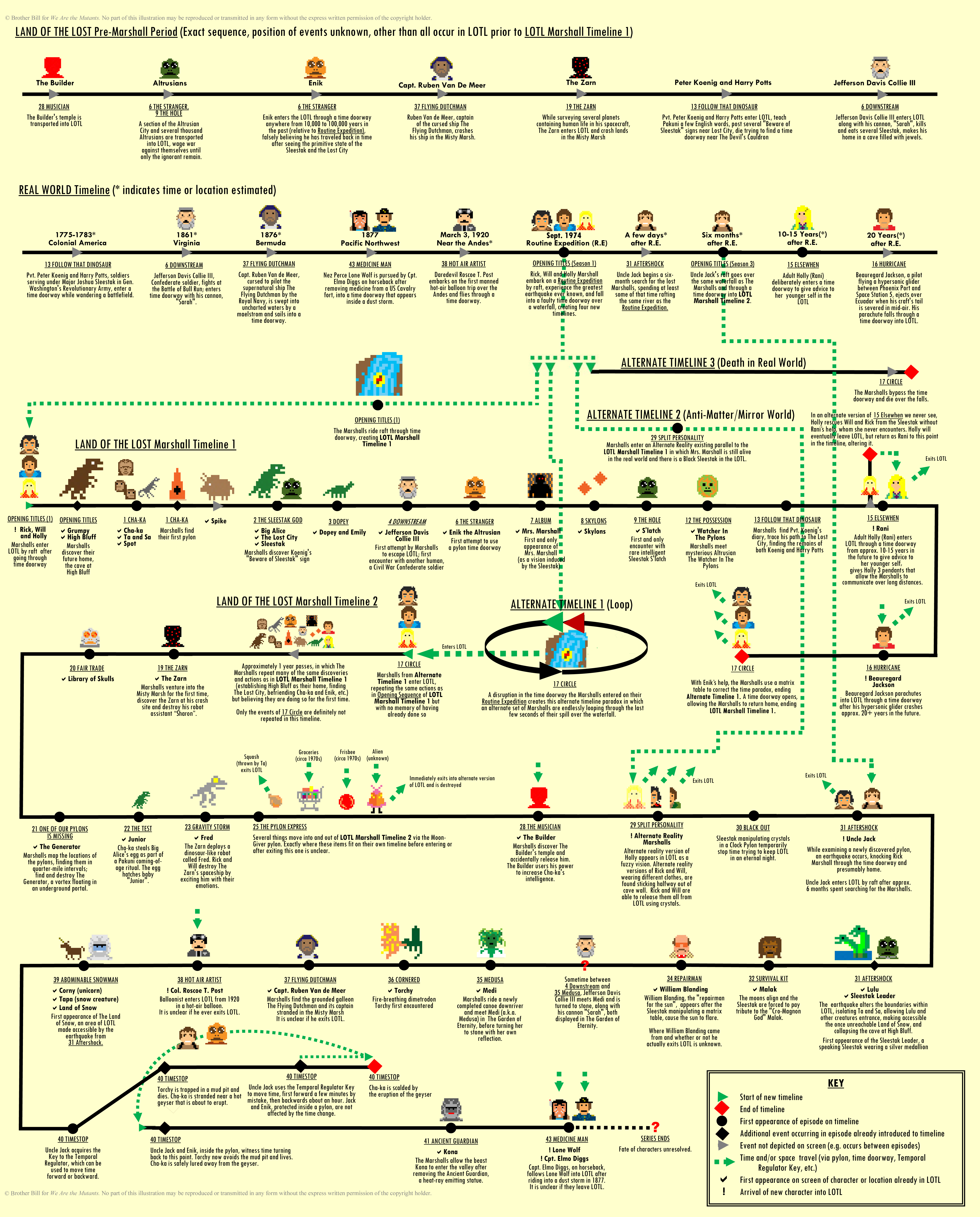 This timeline (also available in PDF) attempts to chronicle key events from the original Land of the Lost series, which ran for three seasons from 1974-1976. Key events include the introduction of a new character or location, any traveling through time and/or space via time doorway or other paranormal means, events that altered the geography or climate of the Land of the Lost itself (like the big earthquake that literally shakes things up at the beginning of season three), etc.