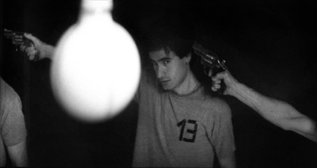 Sébastian is hooded and driven to a crumbling building in a remote forest. After some initial tension when he explains to the event hosts that he is coming as Godon’s replacement, we learn the nature of the assignment and why it pays so handsomely. He is now a contestant in an underground Russian roulette betting circle, and, due to the illegal nature of the event, his participation is now compulsory. Thirteen men stand in a circle with a revolver aimed at the head of the person in front of them. A single round is loaded in each gun and the chamber spun while a master of ceremonies shouts instructions. Hanging from overhead is a light-bulb marked with dark lines. All contestants are ordered to stare at the bulb. When it lights, everyone pulls their trigger. Some live, some die. Sébastian survives the first round, but can’t bring himself to pull his own trigger on cue, causing “referees” (of a sort) to intervene and force him to complete his action. After the round, new bets are placed by the gallery of wealthy gamblers while the survivors “relax” in a makeshift lounge where various refreshments, including injections of lithium, are available. The next round begins with two bullets loaded in each gun, then three, etc., until there is only one survivor left.