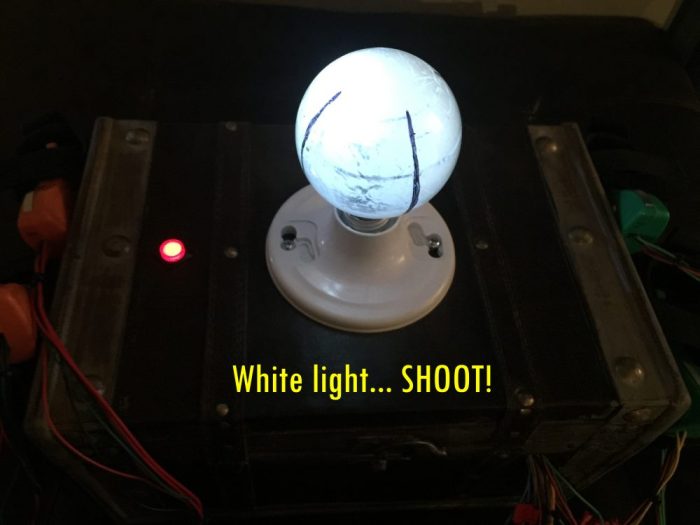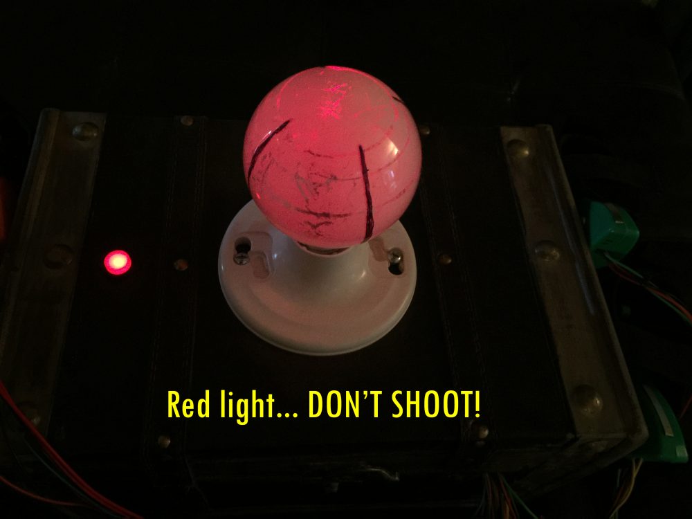The game as played in the film was pure luck: players spun the chamber and fired at the person in front of them, having no control over whether they lived or died. Only the people placing bets were having any fun. I knew this wouldn’t work for my adaptation. I wanted a game of skill that would be fun for the participants. In my version, the first person to pull the trigger when the bulb lights is the winner. To make it a little more interesting and build anticipation, the bulb would flash red a few times randomly before finally lighting white. If a player “jumps the gun” and pulls his trigger on red, their gun is dead for the rest of the round.