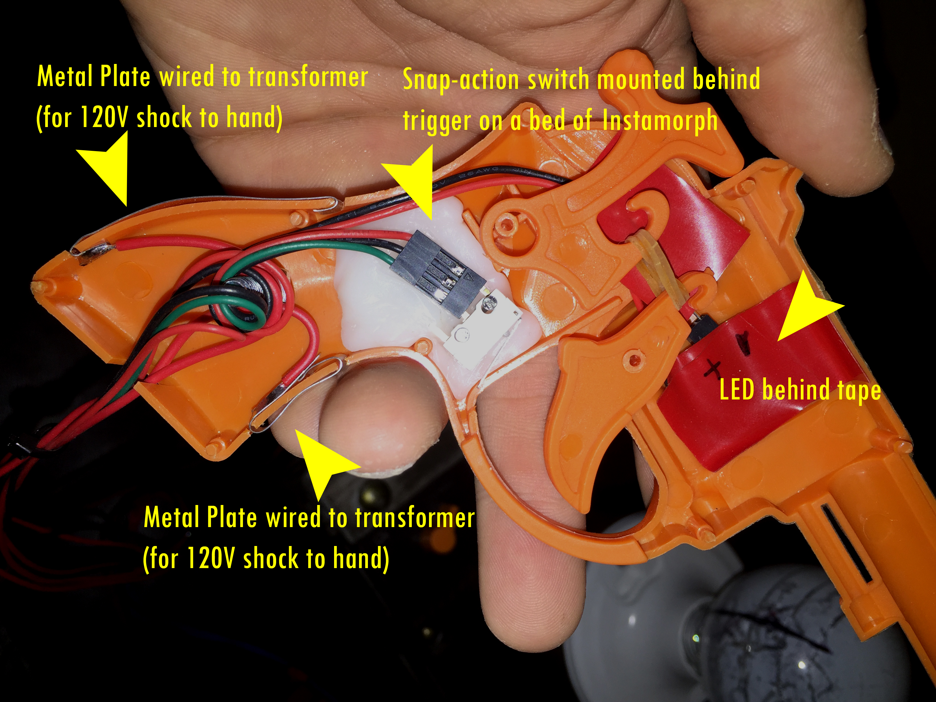 Each gun was popped open and wired with a snap-action switch behind the trigger, metal plates on the handle to conduct the electric shock, and a red LED to indicate the winning gun. (See short video demos of the assembled, LED-enabled guns here and here.) To create a flat surface to mount the switch to, I used a glob of Instamorph, a type of project plastic that softens in boiling water but dries rock hard.