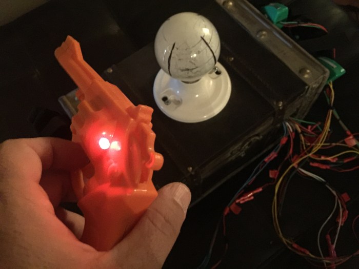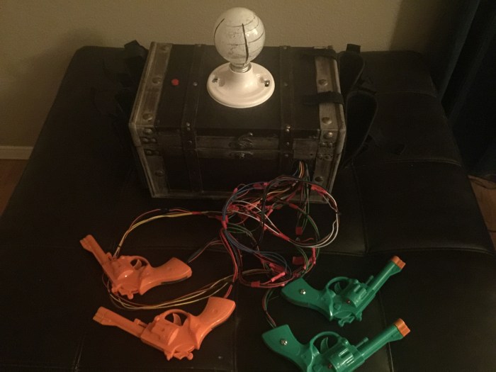 The light bulb was not only an important practical piece for the game, but an iconic element from the film. I used a real light bulb, hollowed it out completely, then fed a red and white LED into it from below to get the necessary red light/white light functionality. I had to mount it to something, and I also needed a container to hold the electronic parts and the guns, so I used a trunk box from a local hobby shop that looked like something you might find in an old attic. By the time I got everything wired together and mounted in the box there was no room for the guns (and the approximate 100 feet of wire attaching them to the Arduino), so I just mounted holsters to the sides instead. Real holsters were cheaper than toy/costume holsters, so that’s what I used.