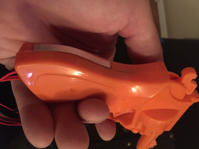 So, I knew in advance that this project would move at a snail’s pace while I relearned basic electronics and picked up tools like a soldering iron and a multimeter for the first time. I’d been reading about Arduino, a microcontroller that lets you connect multiple external components and control them with code written on a PC. This seemed like the perfect time to give it a try. But first I had to deal with a practical issue: I was going to need guns. Toy guns, of course, but they had to meet three requirements: they had to resemble revolvers (not semi-automatic or sci-fi), have a snap-action trigger for the players to pull, and be easy to snap apart. I lucked out immediately when I found a “Police Playset” at a dollar store, a blister-packed kit of foam and plastic junk, redeemed by one hell of a perfect toy revolver! Thirteen players wasn’t very realistic, so I settled on four, purchasing eight kits in case I wrecked a few while prototyping.