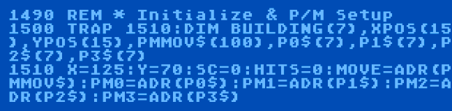 Why in the world have we done this? Again, it’s all about memory. When programming Player/Missile Graphics, the memory location of each player’s image data must be known. When we DIM a string variable, the Atari sets aside a location in free memory that’s just the size we need, and we can now obtain that location by using the ADR statement. For example, ADR(A$) will tell us the address of the memory containing the bytes of A$. So, if our player image is stored in a string variable called P1$ (as in line 1620 above), then we can tell the computer that our player image is located in memory at ADR(P1$). Let’s take a look at the first few lines of our Player/Missile Graphics initialization.
