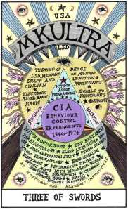 A variety of influential thinkers and theories appear in the deck, from mainstream establishment government, intelligence, and military figures to academics and counterculture icons. The deck’s subjects illustrate the fact that the lines between the mainstream and the counterculture were especially porous, especially when bleeding-edge technology and social theory were concerned. Competing visions of the future from the revolutionary ’60s merge as the cybernetic consensus finds its apex in the formation of the Internet in the ’90s. Here was a system, created by military and government funding, but first “settled” by anti-establishment thinkers. The deck suggests that the revolutionary promise of the Internet is now fully in the hands of private industry, all watched over by machines of government surveillance (the deck’s “Queen of Pentacles”).