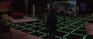 In 1981, Information International, Inc. (or Triple-I) released Adam Powers, The Juggler, a short computer animation that, in addition to one of the first CGI anthropomorphic characters, featured various glowing grids, and the company (which also contributed visuals to Westworld, Futureworld, and Close Encounters of the Third Kind) also provided effects for the film Looker (1981), whose plot involved fashion models being “topographically” scanned in order to be recreated as virtual simulacra. Looker‘s climax features a shoot-out against a glowing green grid, this one a virtual stage upon which computer-generated commercials are produced. The glowing matrix is dotted with fitted kitchens, sportscars, and other ephemera of Western consumerism, like some crass update of 2001‘s hotel room.