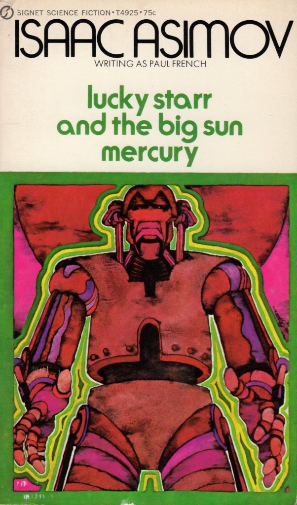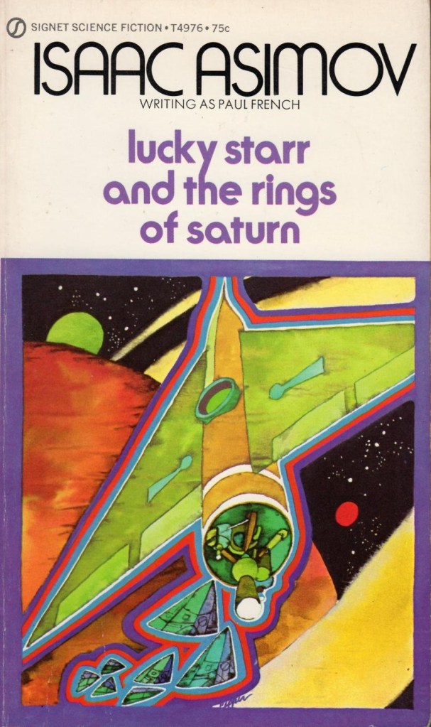 Originally published between 1952 and 1958 under the pseudonym Paul French, Isaac Asimov’s Lucky Star series details the exploits of David “Lucky” Starr, a prototypical pulp hero waging prototypical Cold War-era, “Us vs. Them” adventures. The books were originally intended as the basis for a children’s television series, a sort of science-fictional Lone Ranger, but the project was abandoned when a competing network started developing Rocky Jones, Space Ranger (1954). Signet released the first paperback editions of the series, and the first editions under Asimov’s own name, in 1971 and 1972, clearly intending to lure the growing science fiction community—by now largely resistant to black and white morality tales—with Bob Pepper’s radiant, kinetic images.