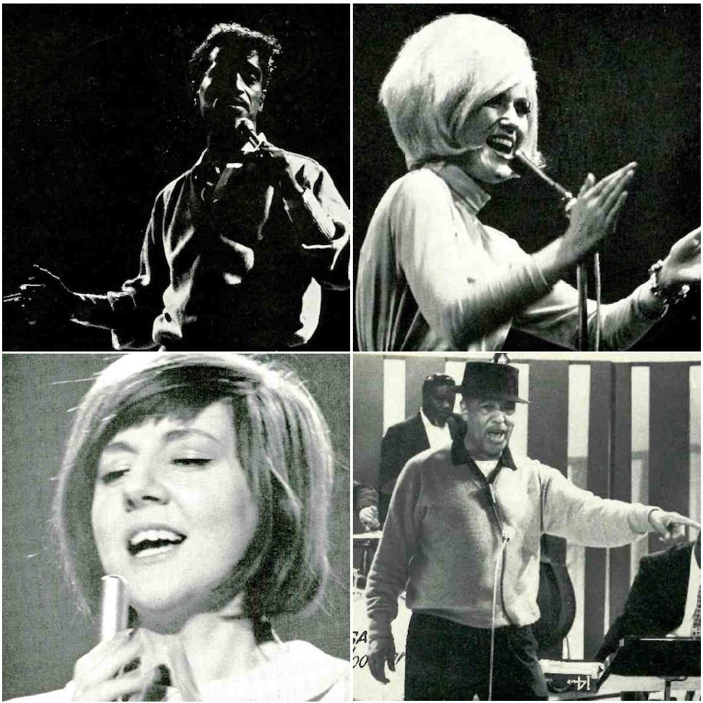 Collage of some of the performers featured in the 1965 BBC Handbook. Left to right from top: Sammy Davis Jr., Cilla Black, Dusty Springfield, and Duke Ellington