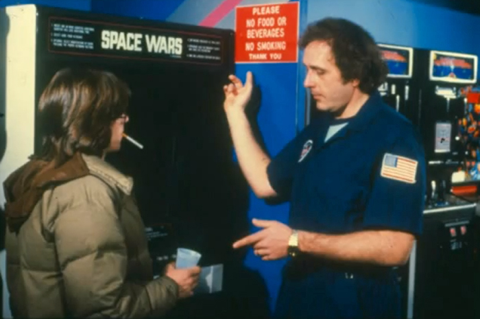 “The first rule to enforce at all times,” intones the narrator, after a short introduction and instructions on how to organize change, “is our ‘no smoking, no eating, and no drinking’ policy.” The accompanying slide shows a scruffy-looking, puffy-jacketed mall rat chomping on a Marlboro and clutching a tiny plastic cup; our Spaceport hero points him to the nearest ashtray. “Never allow people to loiter in your store, or in front of your store” is the next rule, and we catch a glimpse of three not-so-tough-looking teens (scruffy-looking guy included) puffing on unlit cigarettes, in brazen defiance of the red “No Smoking” sign above their heads. This is when we learn that Spaceport is a “family entertainment center,” not the Mos Eisley Cantina. But perhaps there’s some wiggle room: