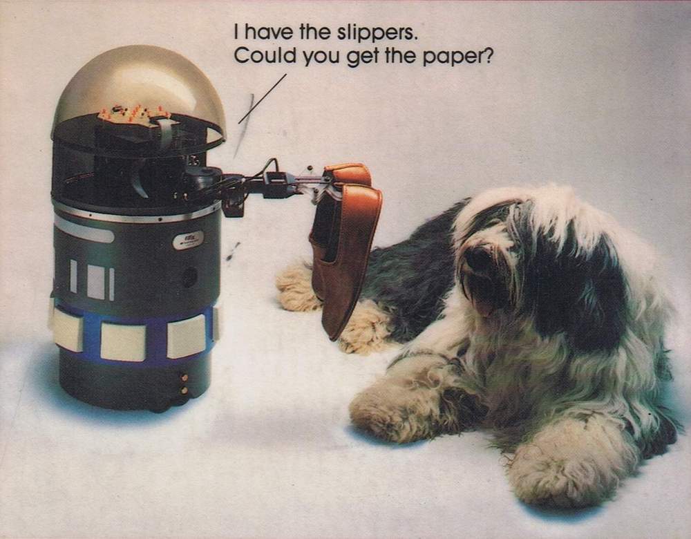 In most fictional 1980s media, homes and businesses were not constrained by the limitations of real-life technology. In Rocky IV (1985), the ambient American anxieties of man vs. machine are made expressly literal with the competing training montages of Rocky Balboa (chopping wood and climbing mountains in Russia) and Soviet fighter Ivan Drago (working out in gyms and labs, hooked up to equipment like some kind of Communist cyborg). But it’s the comic relief plot of Rocky IV that better shows off the aspirational hopes of domestic robotics. As Rocky’s son videotapes with a home camcorder, Rocky presents brother-in-law and Philly schlub Paulie with a home robot on Paulie’s birthday. The robot, Sico, was used in many movie and TV productions (enough to have its own Screen Actors Guild card) and has an interesting origin story of its own. Much as Neil Young’s experimentation with electronic instrumentation was partially an attempt to reach his son, who has cerebral palsy, Stallone’s interest in Sico stemmed from his son Seargeoh’s autism. Sico was designed by Robert Doornick, a robotics researcher and entrepreneur who found promise in the idea of robots aiding autistic students with communication skills. In Rocky IV, Sico is given to Paulie for “companionship,” which is even more intriguing given present-day trends in elder-care robotics (memorably explored in the 2012 film Robot & Frank).