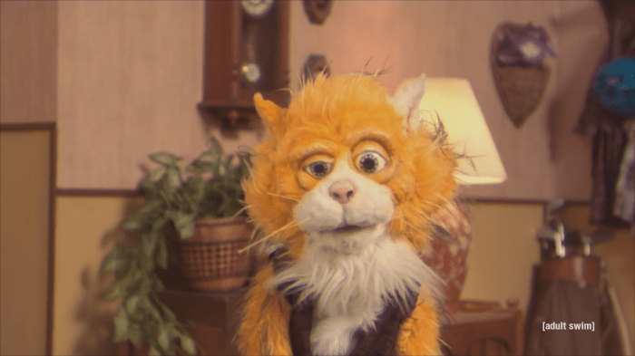 “Smarf” before and after his revelation as a Terminator-style cyborg in the Adult Swim short “Too Many Cooks” (2014)