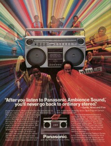 The boombox was a piece of cutting-edge technology no less important socially than the contemporaneous introduction of the Sony Walkman (1979). The more widespread availability of the cassette tape led to a revolution in music listening, both privately on headphones and publicly on boomboxes. Panasonic, a Japanese company whose futuristic slogan “Just slightly ahead of our time” jibed nicely with EWF’s futuristic bent, introduced this line of “portable stereos” that promised ambient surround-sound and a more pleasurable listening experience than transistor radios. While the ads all show EWF bestowing this futuristic technology on white consumers and listeners, the real innovative use of the boombox was happening in Black America, as breakdancing and B-boy culture emerged from the DJ-led clubs and into the streets in the 1980s. With a portable boombox, you could perform anywhere. You could be your own DJ.