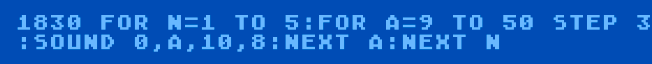 The outer loop repeats the effect five times, while the inner loop controls the pitch of the sound effect. By looping from 9 to 50 and incrementing by 3, the SOUND statement produces a tone that quickly falls from high to low pitch (line 1830). Even though we’re using a pure tone for the distortion value, this type of effect has become well-known as what lasers sound like in games of the 8-bit era.