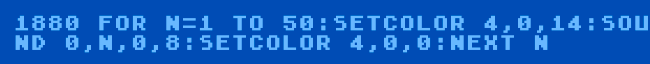 A very similar loop creates the explosion sound when one of our bases is destroyed, using a distortion value of 0. The particular distortion sounds like static, so by changing the pitch from 0 to 50, we get a sound quite similar to a violent explosion diminishing as it ends (line 1880). As described in Lesson Six, the SETCOLOR statements cause the playfield background to strobe to really sell the effect.