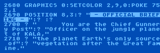 If the player decides to read the briefing, displaying the text is quite simple. We switch to Graphics 0, which is the standard 40 column text mode, set the background color with SETCOLOR, and then POKE register 752, which hides the cursor that normally appears when using Graphics 0 (line 2680). The next several lines of code are only POSITION and PRINT statements to display the backstory and instructions, using both lowercase and inverse text styles available in ATASCII.
