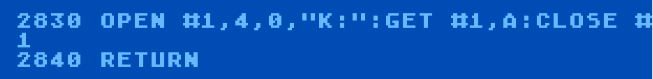 Since we have asked the player to respond to our question with “Y” or “N,” we need to check for those keystrokes. We can do this with another Input/Output Control Block referencing the keyboard as its device. First, we use the OPEN statement, which lets us specify an IOCB number, whether we are reading or writing to the device, and a letter to identify the device. The statement OPEN #1, 4, 0, “K:” opens IOCB 1 for reading the keyboard. Next, we use the GET statement to actually read from the IOCB, putting the value in variable A, and then close the IOCB (line 2640). When this line of code finishes executing, variable A will contain the ATASCII code of whatever key was pressed on the keyboard. If the character code is 89 (Y), we jump to the code that displays the mission briefing (line 2650). If the character code is 78 (N), we RETURN from our subroutine back to the code that draws the playfield and starts the game (line 2660). If any other key is pressed, we simply get another key until the player presses Y or N (line 2670).