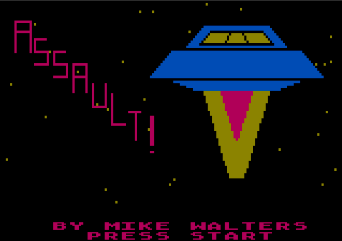 The title screen has been an essential element of video game design since the beginning, appearing in nearly every arcade game, home cartridge game, and even amateur software. As a 16-year old programmer, it was unthinkable to create a game without some display of the game’s title, author credit, and the ubiquitous “Press Start” message. Space Assault’s title screen is produced by quite a bit of code, but it was important to set the mood. The title screen concept eventually evolved into attract mode, where game play was demonstrated to entice the player to drop a quarter or press a button, and even today most software includes a splash screen or page to serve a similar purpose.