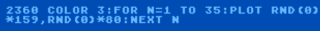 You may notice that our title screen is mostly composed of a graphic image, but also includes two lines of large text at the bottom. This is accomplished through yet another powerful feature of Atari’s ANTIC chip that allows multiple graphics modes to be combined in a single screen. This is done by manipulating the display list, which was also the secret of the earthquake effect covered in Lesson Six. Creating a custom display list is a fascinating but complex topic, which will be covered in full in our next lesson. For now, we’ll draw the title screen image using the same PLOT and DRAWTO techniques we examined way back in Lesson Two. In fact, the first task is to fill the screen with some random stars (line 2360), which we covered in Lesson One.