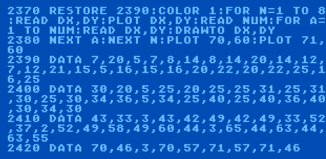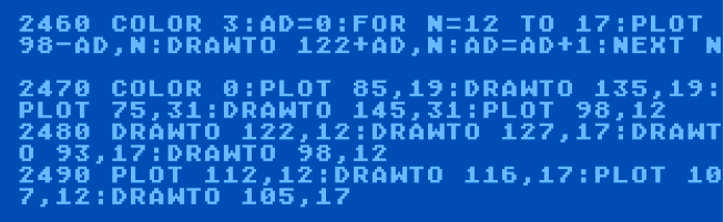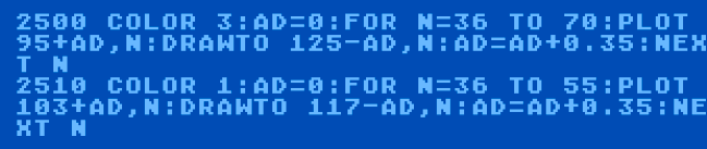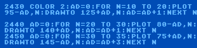 The large saucer image begins with three blue polygons. Each of these is created by simple loops plus an additional offset variable called AD (for “add”). The loop variable N is used for the vertical coordinate, and AD is used for an offset between two horizontal coordinates. The code inside each loop creates a horizontal line with PLOT and DRAWTO, then increases the offset to make the polygon wider or narrower as the loop progresses (lines 2430-2450).