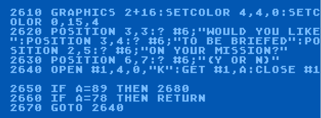L7 13CodeYN Published June 8, 2017 at 657 × 242 in Adventures in Atari BASIC: Lesson Seven – Music and Mission Briefings ← Previous Next → Share this:Tweet