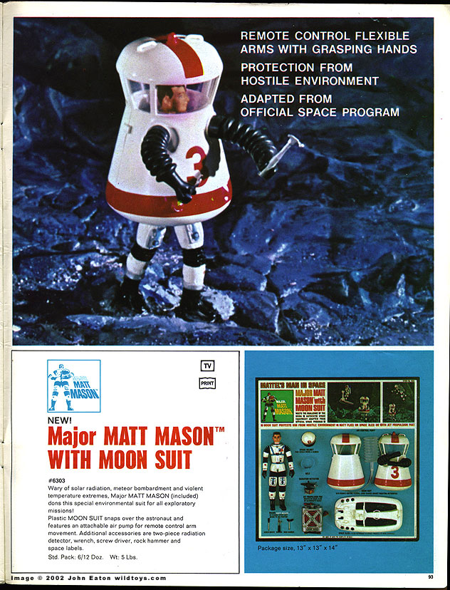Matt Mason (named after Mattel co-founder Harold “Matt” Matson) was a hero, but he wasn’t a superhero. He and his team, including African-American Jeff Long, represented “the face of every astronaut,” and their equipment was “based on official space program designs” that were featured in magazines such as Life, Jane’s, and National Geographic. Mason’s Moon Suit was, in fact, a near-exact replica of a prototype that graced the cover of Life in April 1962. Many of the designers of the Matt Mason toys happened to be former aerospace engineers, including John Northrop, the son of Jack Northrop, founder of the Northrop Corporation (now Northrop Grumman) and innovator of the flying wing aircraft model.