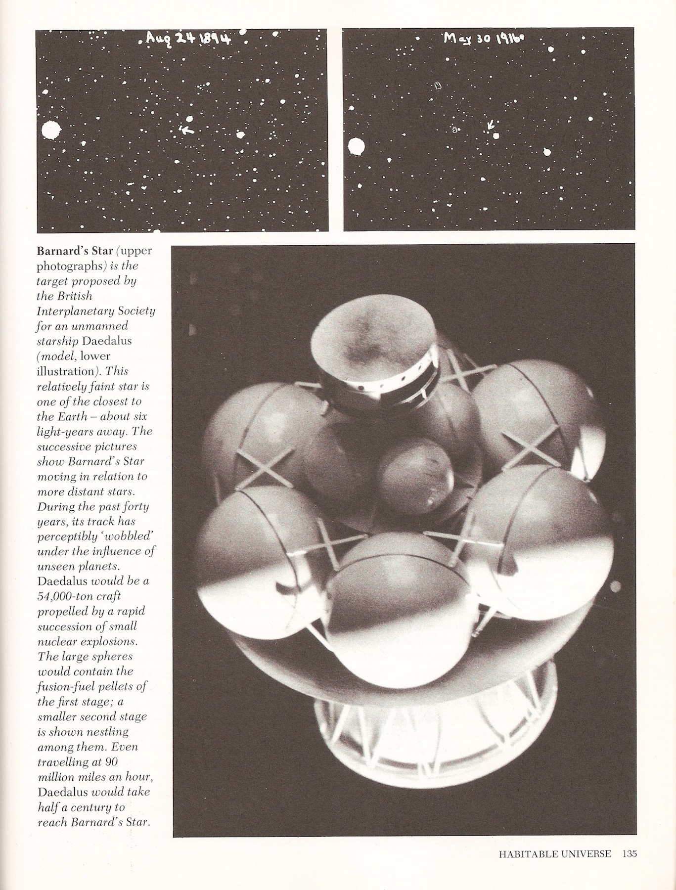The book presents a number of artist renderings and models of the kinds of habitats the contributors thought would nurture humanity in its coming colonization of space, and the kinds of spacecraft that might take them to the neighboring bodies of our system—and even to distant star systems. Both the nuclear detonation-propulsion drive vehicle from Dyson’s Project Orion, first posited in the 1950s, and the more contemporary Project Daedalus, designed by the British Interplanetary Society’s Alan Bond, were featured. Both would later be discussed on Carl Sagan’s series Cosmos (1980), specifically in the eighth episode titled “Travels In Space and Time,” which touched on interstellar sublight travel.