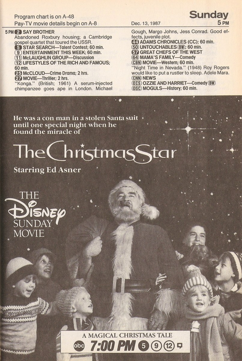 tv guide ed asner the christmas star 1987 Published December 11, 2017 at 1462 × 2177 in Upscale Toys and Escaped Mental Patients: ‘TV Guide’, December 12 – 18, 1987 ← Previous Next → Ed Asner in The Christmas Star, early in Disney and ABC’s corporate relationship: Disney would gobble up ABC in 1996. Share this:Tweet