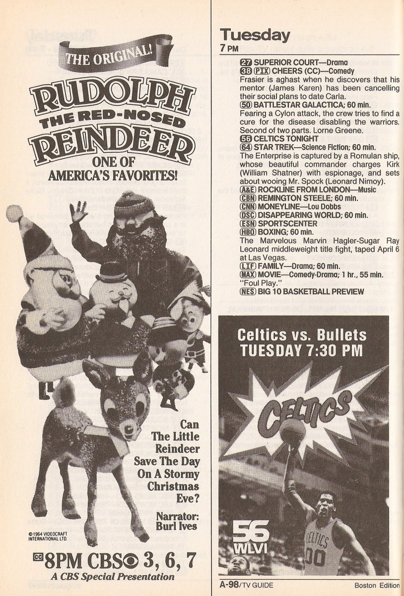 Rudolph the Red-Nosed Reindeer was a holiday institution by this point. Local independent channel 56 brings the 1986 World Champion Boston Celtics into millions of New England homes.