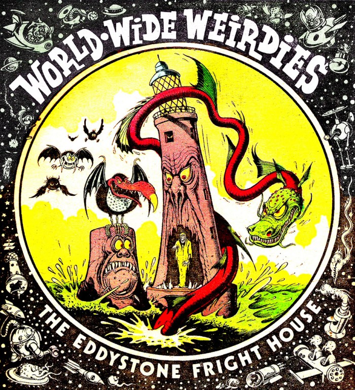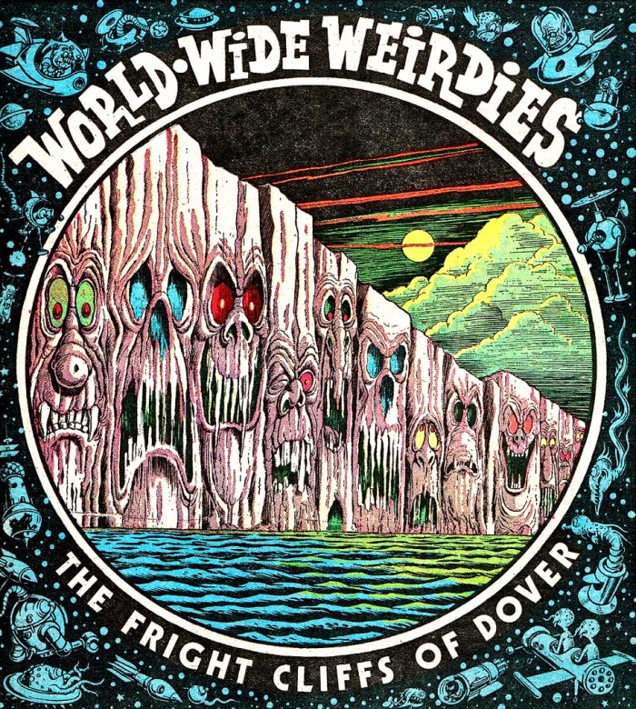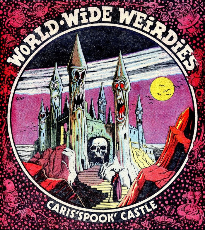 The ideal showcase for his arresting art, World-Wide Weirdies was a series of full-color pin-ups where Reid took atrocious horror-related puns sent in by readers and turned them into monstro-pomorphic vignettes. Reid had previously provided similar features—Wanted posters and Creepy Creations, respectively—for Whoopee! and Shiver and Shake, a horror-related sister comic; after the latter was absorbed into the former, World-Wide Weirdies made their debut. The readers whose puns were chosen received two pounds—big money for a schoolchild in the Britain of the 1970s, when it was enough to buy more than twenty comics.
