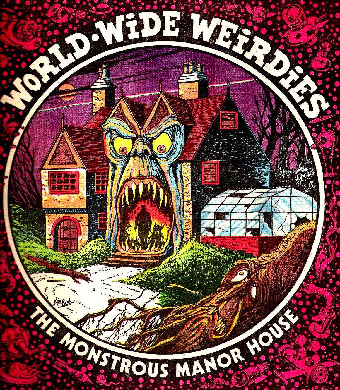 The ideal showcase for his arresting art, World-Wide Weirdies was a series of full-color pin-ups where Reid took atrocious horror-related puns sent in by readers and turned them into monstro-pomorphic vignettes. Reid had previously provided similar features—Wanted posters and Creepy Creations, respectively—for Whoopee! and Shiver and Shake, a horror-related sister comic; after the latter was absorbed into the former, World-Wide Weirdies made their debut. The readers whose puns were chosen received two pounds—big money for a schoolchild in the Britain of the 1970s, when it was enough to buy more than twenty comics.
