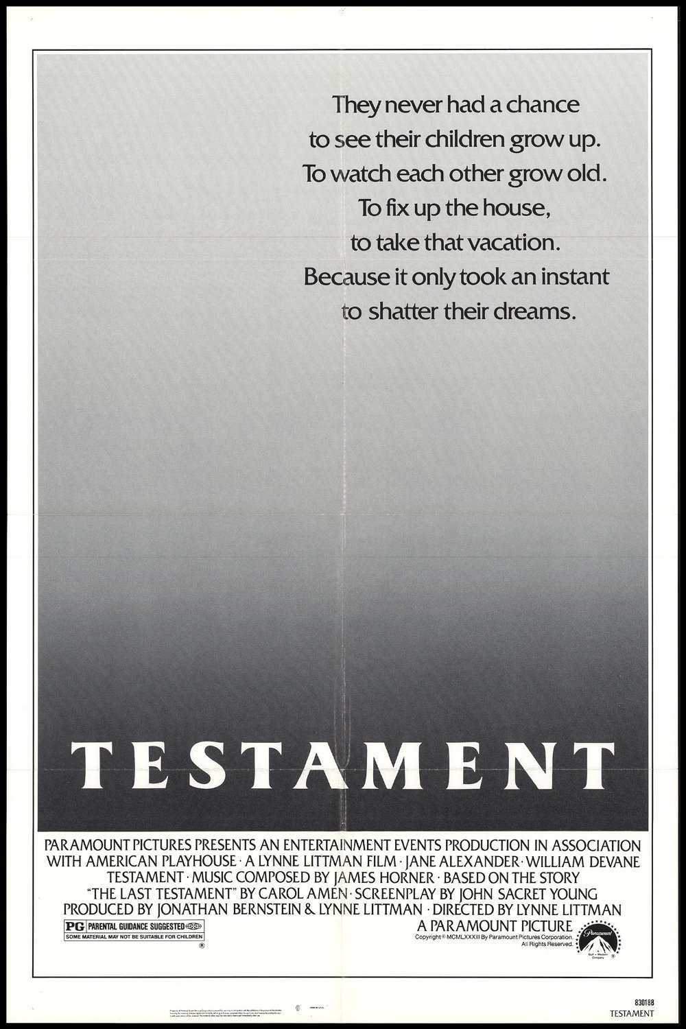 With its calm tonal palette and inoffensive James Horner score, suggestive of TV movies about domestic tragedy on the scale of divorce or alcoholism, one can imagine a grandparent of any political persuasion sitting down to watch it. In terms of production values, Testament sits somewhere between that well-made TV movie and a feature film proper, and its artlessness and lack of pretension, make it, if anything, even more upsetting and disorientating when things start to get really awful. Handled with a little less sensitivity and compassion, it could easily have been mawkish; but it isn’t, and Testament refuses to underline any particular aspect of the situation. There is simply the grind of life getting worse and worse until it is intolerably awful and you cannot survive. The economy with which the characters are sketched lends them a blank credibility, and the absence of any of the iconography of nuclear war (not even a single radioactive symbol) only adds to the film’s power.