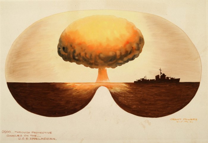 In the 1946 poem of the same name (written in imitation of the medieval alliterative verse he had studied under J.R.R. Tolkien), W. H. Auden dubbed the new era “The Age of Anxiety,” and the same year, Charles Bittinger was one of the first artists to immortalize its symbol in paint. Bittinger, who had abandoned a career in science for the arts before working in the U.S. Naval Camouflage Section in both world wars, was one of several artists the Navy invited to paint the atomic tests at Bikini Atoll. His mushrooms are white, vaporous affairs, like that which can be seen in British artist Weaver Hawkins‘ Atomic Power, painted the following year.