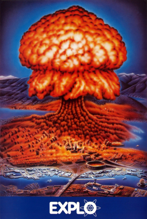 Perhaps deterred by the overt embodiment of its own metaphoric power—or perhaps because it was already being done to death by the lowly pulps—the world of fine arts abandoned the mushroom cloud after a a brief blush of interest, leaving it in the hands of commercial illustrators, who planted it inside and outside countless books, magazines, comic books, and record covers. As time passed, depictions of the cloud mutated along with nuclear weapons technology itself and the political development of mutually assured destruction: Chesley Bonestell’s cover for the August 5th, 1950 edition of Collier’s magazine provided an unusual alternate interpretation of its subject matter that looked more like a fireball atop a volcano than a mushroom, while David Pattee’s cover for Astounding Science Fiction magazine the same year showed the mushroom in more recognizable form. The mushroom’s “cloudiness” continued to dominate, and around 1960 the symbol assumed the sharper outlines of the archetypal mushroom. As it moved into the ’70s, though, the cloud—like the times—grew darker and was often lit from within, like the example on the cover of Flying Buffalo’s Nuclear War card game. As the decade drew to a close, the emphasis was often upon these hellish infernos raging within the mushroom cloud’s “cap.” Before, it had been sometimes rendered as a fireball, frightening but comprehensible, while now it increasingly glowed with unearthly light like that shown in visionary artist Alex Grey‘s 1980 Nuclear Crucifixion, which also highlighted the cloud’s odd resemblance to the cross.