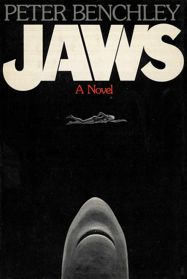 For the hardcover edition of Jaws, published by Doubleday, Bacon placed an abstract shark at the bottom edge of the jacket, the monstrous creature plunging upwards and seen from underneath, against a stark black background. A grey swimmer floats ominously in the blackness, unaware of the predator about to strike. A perfect evocation of the primal fears (some of them obviously Freudian) lurking at the heart of both the book and the film, the image nevertheless proved to be too contemplative for the paperback, released by Bantam Books. Roger Kastel, who later painted the film poster for The Empire Strikes Back, took Bacon’s idea and sensationalized it, adding more color and (literally) more teeth. Kastel’s version appeared on the movie poster as well, of course, and became one of the most recognizable and imitated pop culture symbols in the world.