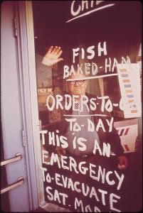 - Evacuation message spelled out on restaurant in the Portland neighborhood of Louisville, Kentucky during chemical spill. Photo by Bill Strode, 1972