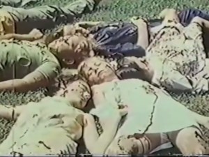 How much worse? A lot worse. If Job had seen this movie, he might have accused it of gilding the miserable lily. There’s a scene in which a commie drives small bamboo spears into a child’s ears so that the kid can “no longer hear the word of God.” That child then appears to puke. Whether the puking is authentic or not is unknown, but certainly the pressure of saving America from the dialectic would be enough to induce vomiting in anyone, especially a child. Other imaginative acts of torture are interspersed with massacres in which extras fall languidly after being machine-gunned by communists. There are many depictions of dead children in the film. Their deaths are robbed of some gravitas by the fact that they are splattered with unrealistic stage blood, as if a sanguine Jackson Pollock had been at them, but it’s still odd to see them all laying there, playing dead for Jesus.