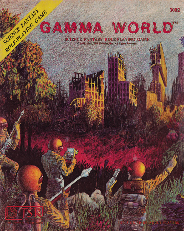 GRASSO: I wanted to talk about two tabletop roleplaying games that explored the aftermath of nuclear apocalypse. At first I was going to venture the thesis that Gamma World, which TSR released in 1978, and Paranoia, developed at West End Games in 1984, are very different visions of a post-apocalyptic future, but now I’m kind of wondering—are they really?