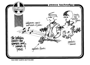 In both his proposal paper from 1979 and in his final, more polished First Earth Battalion Field Manual (completed in 1982), Channon visualizes a soldier who has given up obedience and allegiance to a flag or country, and instead defends the entire Earth. The deep ecological roots of Channon’s proposed soldier are seen in his “Earth Prayer” and the proposal for a nuclear “Conscience Corps” of military families camped outside nuclear missile installations worldwide. Channon envisioned the Battalion as a strike team that could deploy to respond to ecological disaster and live off the land sustainably. His warrior-monks would use the aforementioned methods of biofeedback, meditation, and positive visualization to become physically superior to the ordinary run of soldier. But there was also no fear of modern technology in Channon’s dream battalion. The growing web of worldwide telecommunications and mass media play an essential role in Channon’s envisioning of a First Earth Battalion “battle scenario,” in which people worldwide would see the good works of the kinder, gentler army on their TV screens and react with love and support. Channon’s 1979 job list includes “video technoids,” “cinematographers,” and “satellite technoids.”