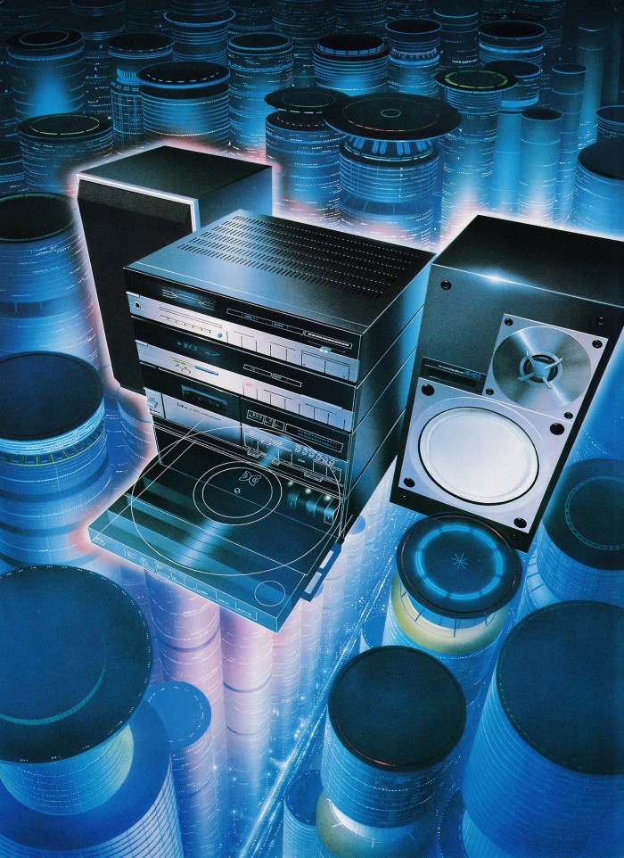 At the same time, the personal computer revolution was in full swing, computer-generated imagery was creating a new breed of spectacle on film, and science fiction had won mass appeal with the success of the original Star Wars trilogy. All of these developments together reflected—or represented—a distinctly futuristic, utopian mood: when the advancing technologies were not expressly advertised as some new form of magic, they were airbrushed (yet another tool that underwent innovation in the ’80s) onto a background of interstellar space. Three of the five ads above were illustrated by Ryo Ohshita, who seems to have specialized in depicting the pioneering audio systems of the time. Clearly taking after one of the most sought-after futurist illustrators of the decade, Shusei Nagaoka, Ohshita’s shimmering visions lend his products an occult grandeur and mystery reminiscent of the hovering Monolith of 2001: A Space Odyssey.