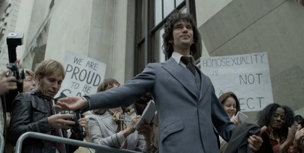 It is also a moment of personal awakening. As he leaves the courtroom, Scott declares to his allies, “I was rude, I was vile, I was queer, I was myself!” This is the most positive declaration of a homosexual identity found in the drama and is a long way from the younger Scott from 17 years ago who considered himself “infected” with the “virus of homosexuality.” Scott then steps outside, where press and gay rights campaigners gather, and proudly poses for photographs, framed by strident political placards.