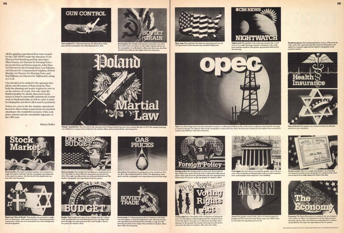 Also from Vol. 10 No. 2 of U&lc from summer of 1983: a feature on how CBS creates graphics for their news programs; as video synthesizer technology became cheaper and easier, TV network graphic departments could create attractive graphics with little lead time.