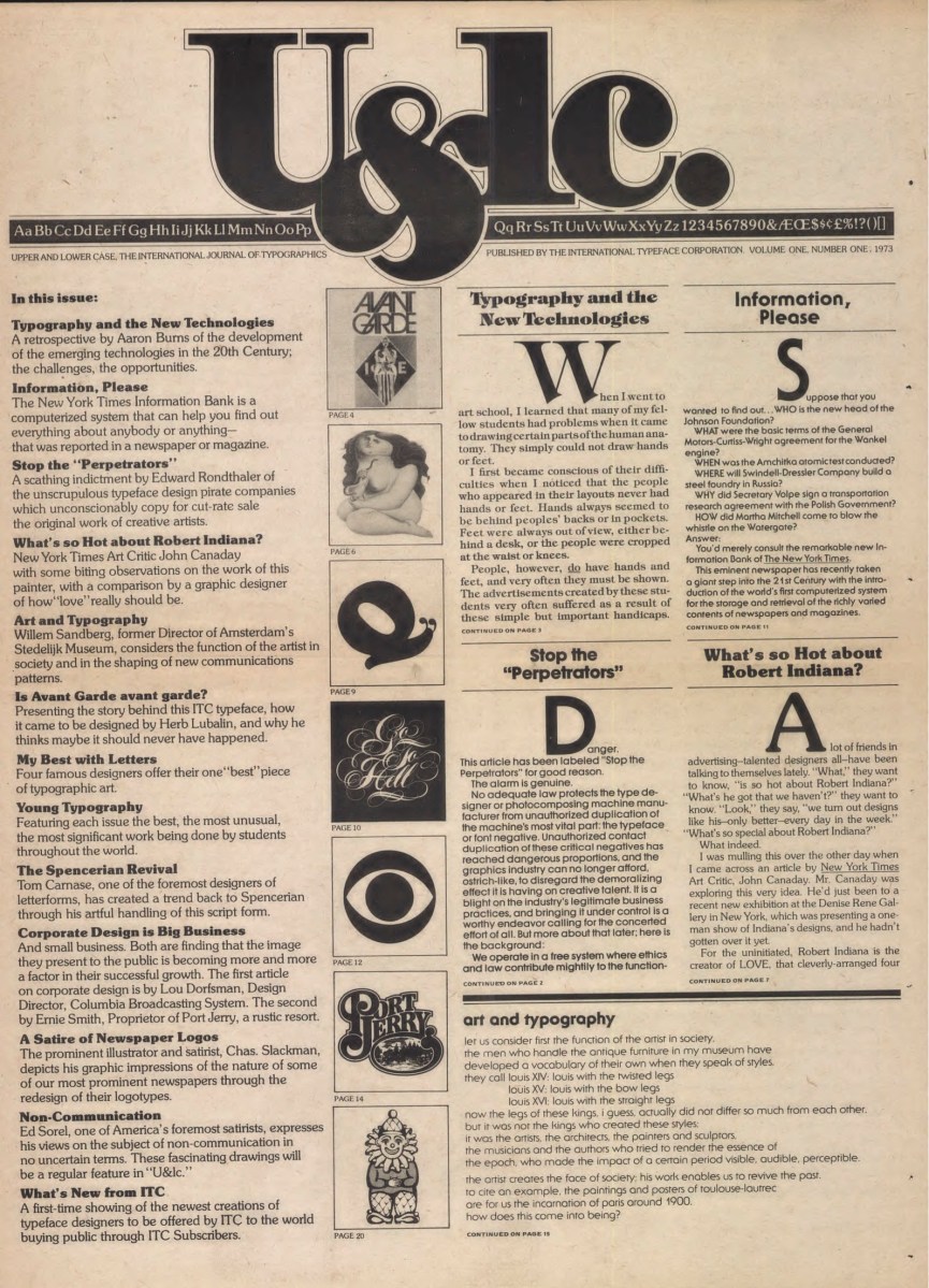 ULC first issue front page Published March 26, 2017 at 1595 × 2212 in The Meaning and the Drama: ‘U&lc’ Magazine, 1973 – 1999 ← Previous Next → Front page of U&lc’s first issue, 1973. Note the story on ITC’s Avant Garde font on page 4. Share this:Tweet