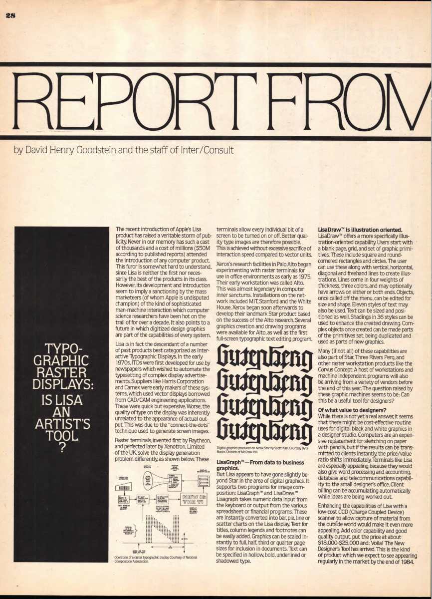 Apple Computer’s Lisa computer was considered a gamechanger for graphic designers and typesetters in 1983 due to its innovative real-time display, but poor sales performance would put dreams of desktop publishing back on the shelf until the mainstreaming of Apple’s Macintosh later in the 1980s.