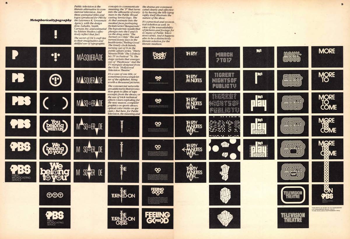 Examples of Lubalin, Smith, Carnase, Inc.’s work for the Public Broadcasting System, U&lc Vol. 2 No. 2, 1975. “[F]or Public Television, the meaning and the drama are communicated clearly and effectively by having the title typography itself illustrate the nature of the show.”