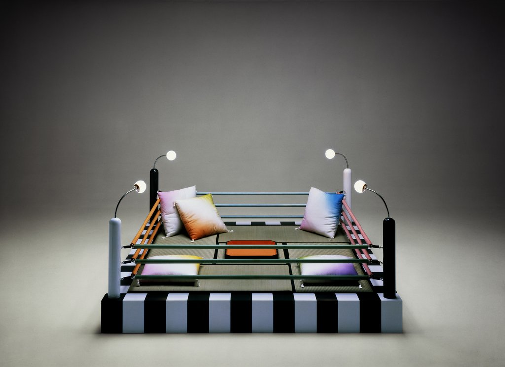 Memphis made its debut at the 1981 edition of Milan’s annual Salone Internazionale del Mobile furniture fair—an event then renowned for its dowdy Mitteleuropean elegance—with a collection that included pieces such as Sottsass’s Carlton Room Divider, Masanori Umeda’s Tawayara boxing ring seating unit, Martine Bedin’s Super Lamp, George Sowden’s Oberoi armchair, and Du Pasquier’s fabrics, which would become icons of the group’s iconoclastic approach. Design pundits and critics were scandalized by what they saw as the tacky vulgarity on display, but the show was a huge and unexpected success with the public, and the style—more often in the hands of the company’s imitators than of Memphis itself—rapidly began to impress itself upon the popular imagination.