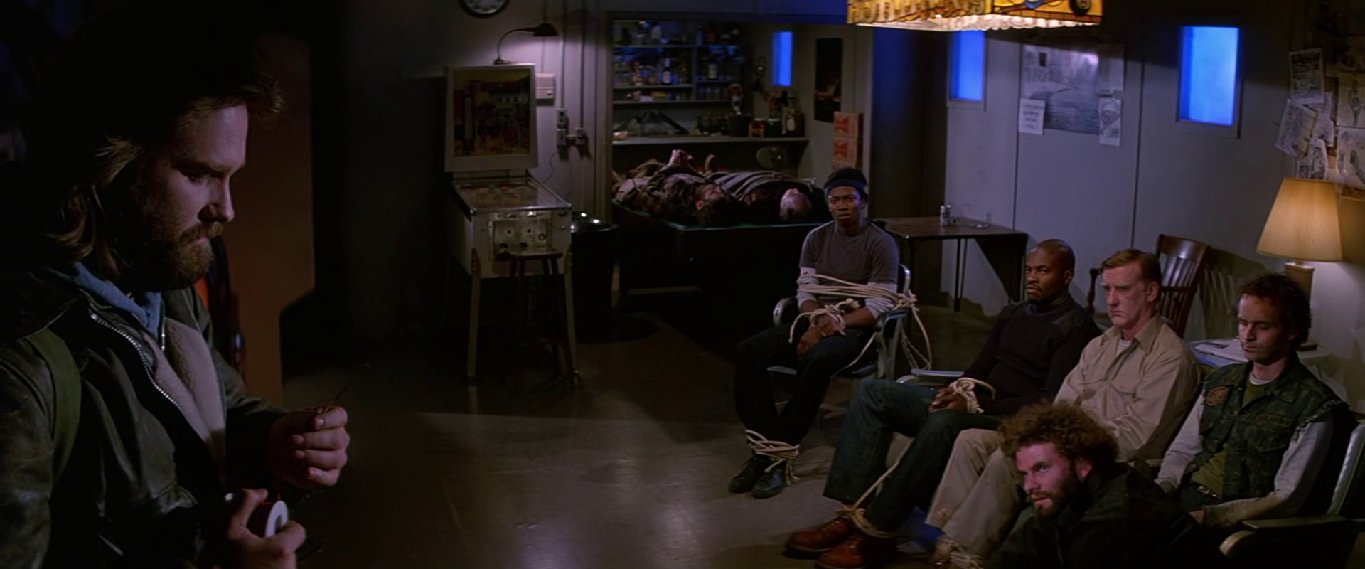 It is significant that the dogs are not the first ones assimilated by the alien. The protean dog has been loose around the base for some time before it is put in the kennel, where it can no longer hide its identity. It seeds copies of itself while the main creature, which has possessed scientist Blair (Wilford Brimley), gets himself locked away alone by pretending to be insane so he can build a spaceship, escape to civilization, and replicate, as the Body Snatchers do. This arc also expresses another chilling aspect of these stories: just how clever the aliens are, and the Blair-Thing leads in this regard. It predicts exactly what the other characters will do, and adjusts its grim plans accordingly. It even knows to choose an older, smaller character instead of one of the alphas like Russell, Mansur, or Keith David’s Childs.