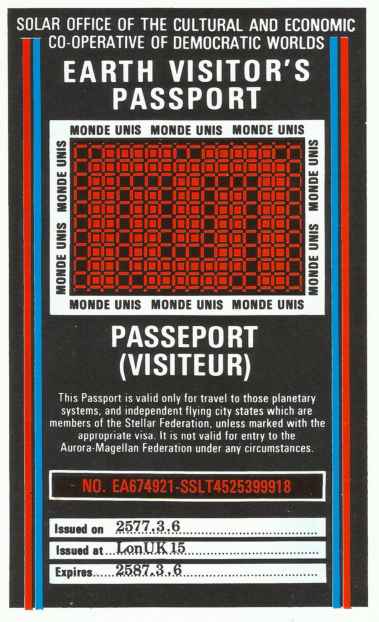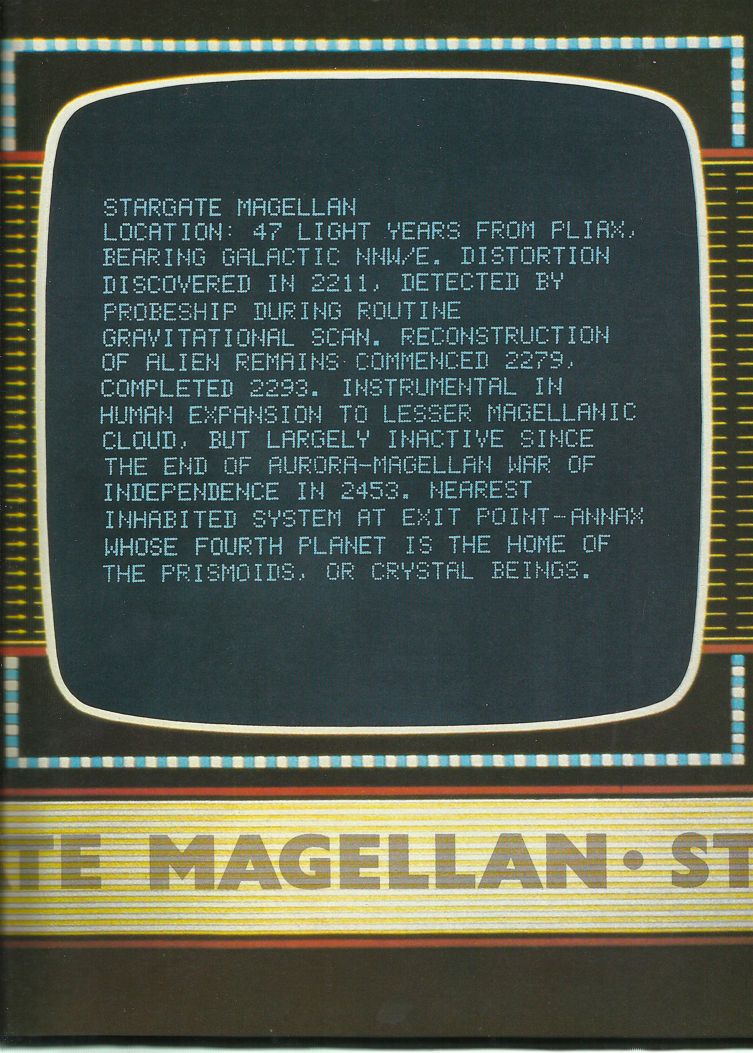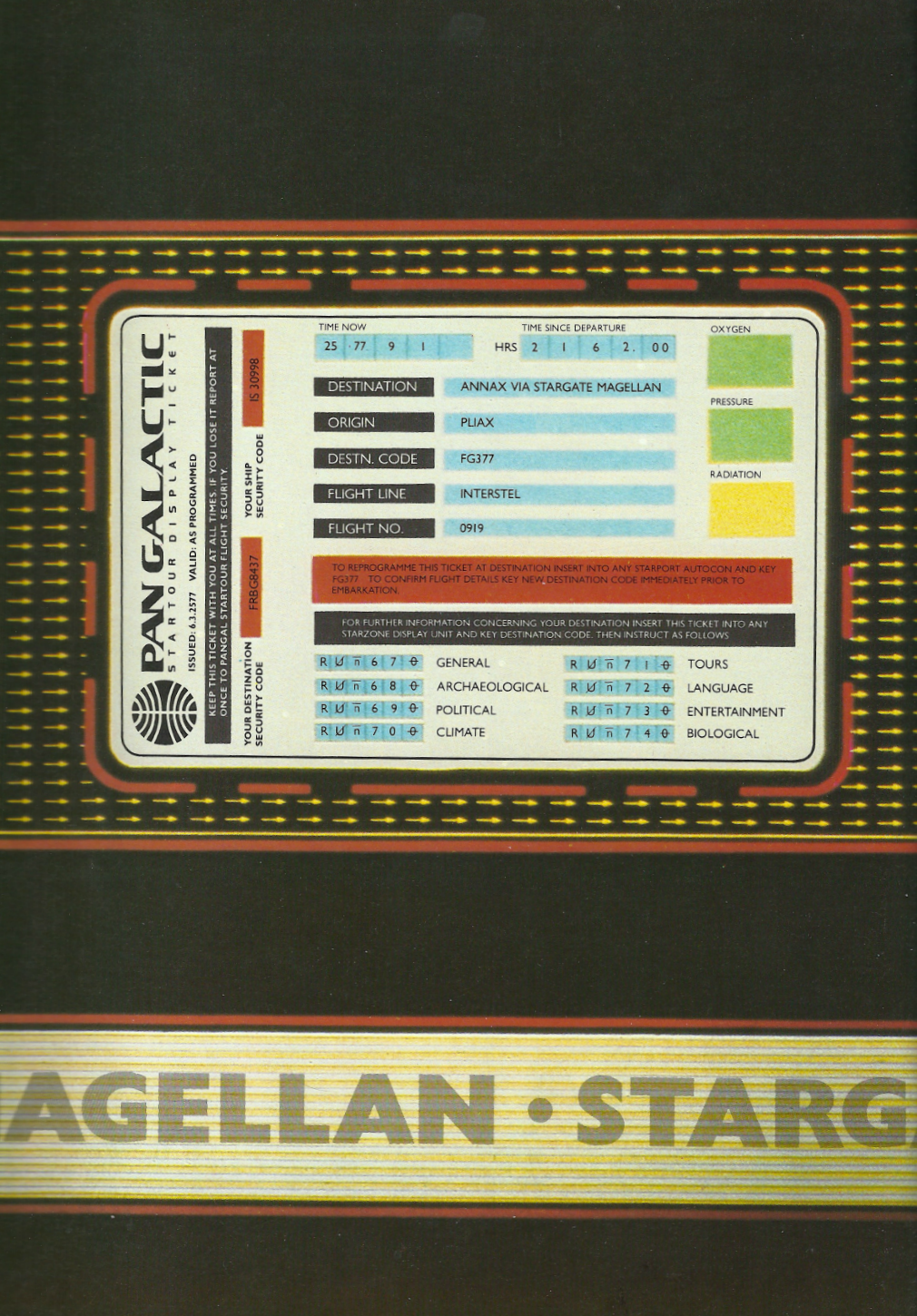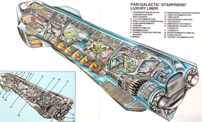 Despite being set 500 years in the future, things haven’t changed much, and the plot itself is all fairly standard stuff that could quite easily be removed (or ignored entirely—see below) without any real consequences: it is the artifact itself that is the real point, the accumulated garishly-colored detail—beautifully rendered cutaways of vast spacecraft, guidebook descriptions, alien planet-scapes, lists of starship insignia and bills of sale—gradually unfolding into a wonderfully surreal and evocative vision of a universe that we will never roam or dominate. In hindsight, there’s also something slightly melancholy about the optimism of its vision: a world where the certainties of the book’s present day, right down to the reassuring division of the world into opposed but fundamentally decent blocs, are extended into a future that, despite its problems, remains basically knowable and human—and thus somewhat mundane.