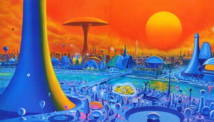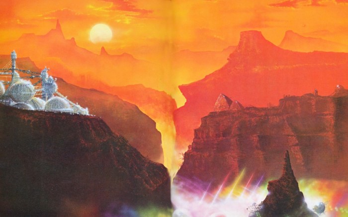 Despite the book’s many inconsistencies, you’d have to be an atrociously miserable bastard not to be at least slightly swept away by the vast, joyous spread of Tour of the Universe. Several of the images it contains (Les Edward‘s Tombworld, for example, or Jim Burns’ Spaceport, or Richard Clifton-Dey’s Behemoth’s World, which was used the same year as the cover art for Blue Öyster Cult’s Cultosaurus Erectus LP), have deservedly come to be regarded as classics of science fiction illustration, though to be honest there isn’t really a dud in the whole thing. The design and layout are beautiful, despite some confusing editorial choices—like the decision to print the diary entries (already the weakest part of the concept) over tight blue lines so as to make them practically illegible—and the book responds viscerally to the then-impossible yearning to be totally visually immersed in the surreal realia and atmospheres of other worlds.