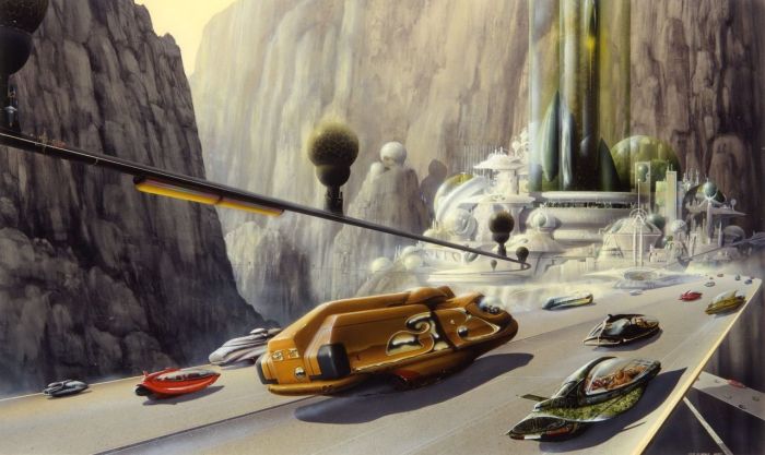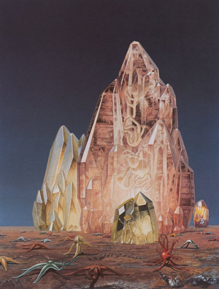 Tour‘s authors were versatile SF and fantasy writer Robert Holdstock, strangely ubiquitous at the time and best known for his 1984 fantasy novel Mythago Wood (video game fans might know him for The Dark Wheel, the novella he wrote to accompany the 1984 computer game Elite), and science fiction editor and critic Malcolm Edwards. The two had previously provided the text for 1979’s Alien Landscapes, a coffee table book featuring Young Artists visions of invented worlds, including Arrakis and Pern.