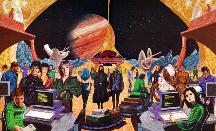 A collision of imperial phase-Young Artists—the London-based illustration agency whose imagery would dominate and define British science fiction and fantasy art throughout the 1970s and ’80s—and an attention to graphic design detail that bordered on the unhinged, Tour of the Universe was a bold attempt to create an immersive world of science fiction art and prose that still looks as wildly ambitious today, nearly 40 years later, as it did when it was first published.