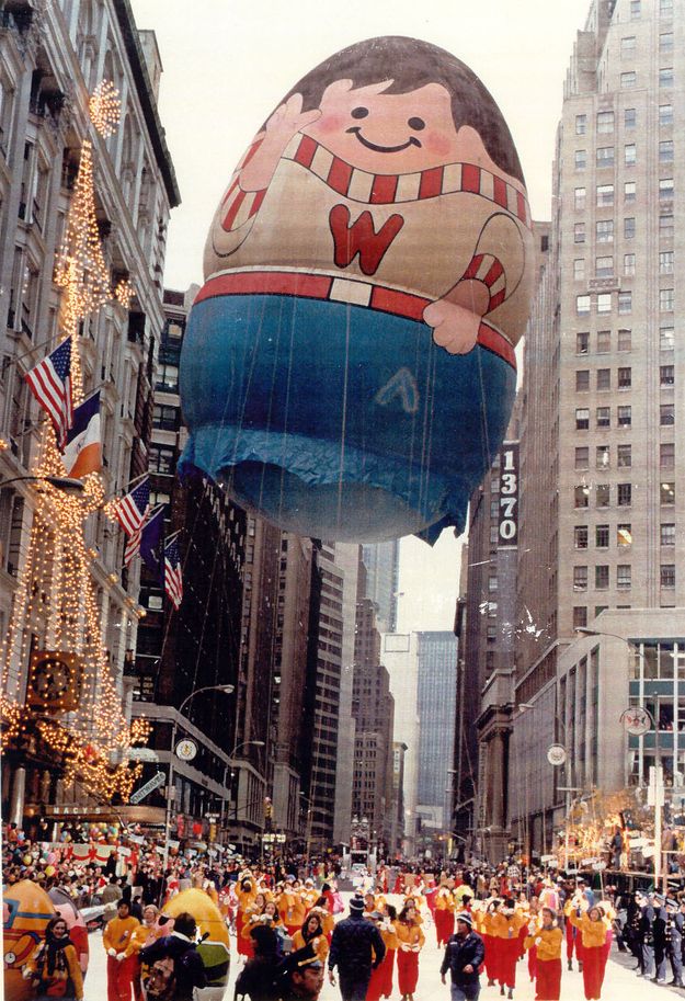 Many familiar Thanksgiving parade regulars were part of the event in 1975: both Underdog and Bullwinkle, mainstays of television syndication by the mid-’70s, were there in balloon form, although rough weather helped scuttle both Underdog and Snoopy. The six-year-old PBS series Sesame Street presented its second float ever, having debuted a year prior in 1974. And it was the final year ever for Elsie the Borden Dairy Cow, a veteran of two New York World’s Fairs. Three toys made their Macy’s parade balloon or float debut in 1975, toys that would become a seminal part of many a 1970s childhood: Weebles, Cooties, and Raggedy Ann.